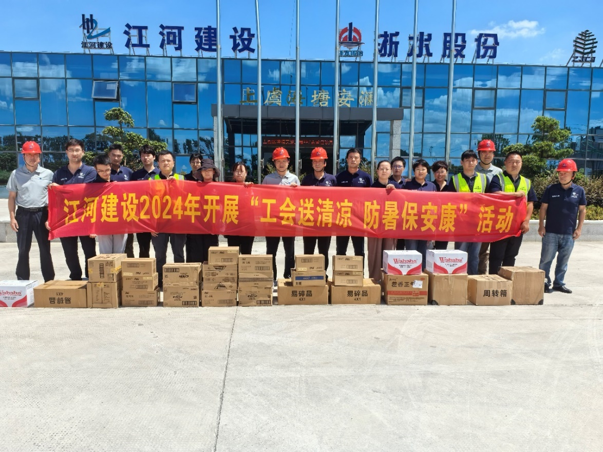 盛夏焦月,驕陽似火,江河建設各重點在建工程項目正在有序推進,一線的職工們備受“烤”驗。為有效改善職工生產生活條件,認真做好高溫天氣職工勞動保護工作。連日來,江河建設黨總支、工會組織開展“工會送清涼,防暑保安康”為主題的高溫慰問活動,成立有工會、總師辦、工程部、安全部等負責人組成的“紅+安全”慰問組,帶著袁偉忠董事長、陳宋江總裁的關懷問候和委托,深入全國各地的項目施工現場,慰問奮戰在高溫一線的項目工人,為其送去礦泉水、毛巾、風油精、西瓜、飲料、藿香正氣水等防暑降溫物品,并為他們的辛勤付出表示感謝。