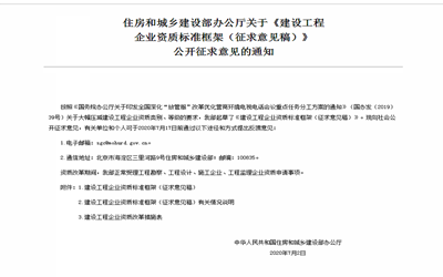 按照《國務院辦公廳關于印發全國深化“放管服”改革優化營商環境電視電話會議重點任務分工方案的通知》(國辦發〔2019〕39號)關于大幅壓減建設工程企業資質類別、等級的要求,我部起草了《建設工程企業資質標準框架(征求意見稿)》。現向社會公開征求意見,有關單位和個人可于2020年7月17日前通過以下途徑和方式提出反饋意見: 1.電子...