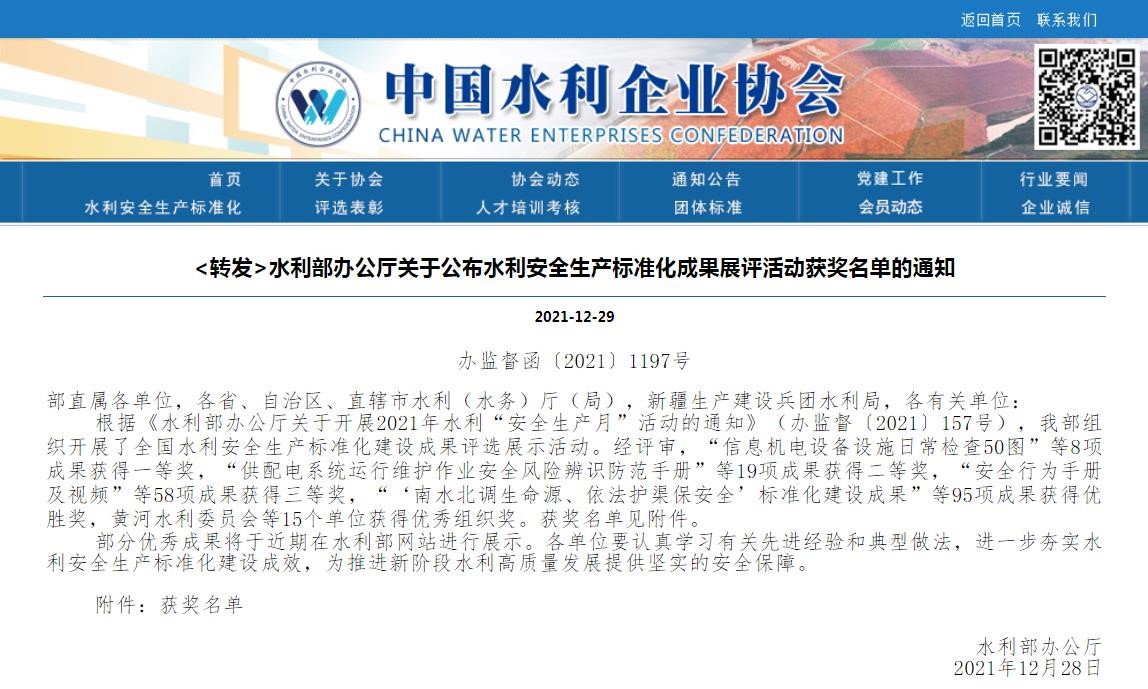 水利安全生產標準化建設成果評審展示活動是水利部2021年安全生產月活動的重要內容之一,該獎項的獲得是對白頭旺水庫項目部安全生產標準化建設的高度肯定,同時也展示了公司良好的企業形象,對持續推進安全生產標準化建設有著積極的作用。