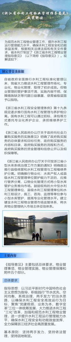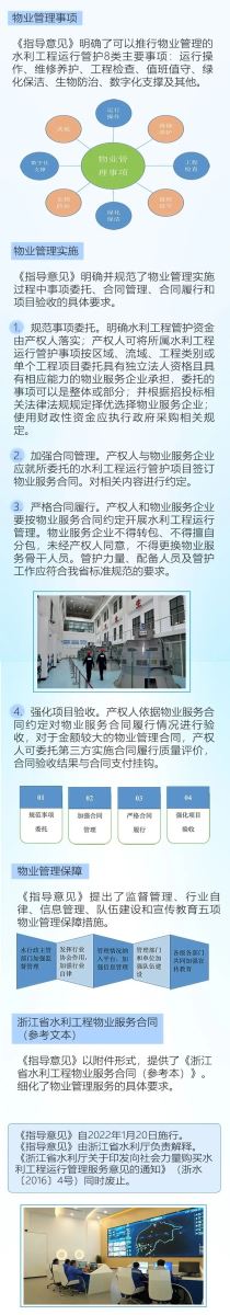 為規(guī)范水利工程物業(yè)管理工作,提升水利工程運(yùn)行管理能力水平,確保水利工程安全和功能效益發(fā)揮,省水利廳制定了《浙江省水利工程物業(yè)管理指導(dǎo)意見》,于2022年1月20日起施行。《指導(dǎo)意見》主要包括總體要求、物業(yè)管理事項(xiàng)、物業(yè)管理實(shí)施、物業(yè)管理保障、物業(yè)服務(wù)合同(參考文本)等內(nèi)容。
