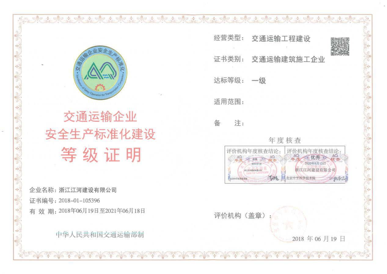 據悉,交通運輸部在此次年度核查實施過程中要求嚴格,經公司自評、提出申請、機構受理、現場考評、逐級審核、社會公示等程序,最終評為安全生產標準化一級達標企業,資質有效期為三年。